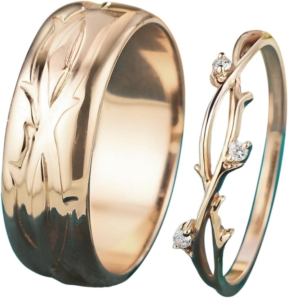 Moissanite Couple Rings Set – Vintage Branch-Design Wedding Bands in 10K 14K 18K Gold for Him and HerThis matching set of wedding bands draws inspiration from nature, featuring a design based on tree branches. The organic lines and natural splits in the band symbolize growth, personal expansion, and the journey of life—how two paths can grow independently yet remain deeply connected at the root. The branching motif reflects the evolution of individual identities within a shared relationship, representing new directions in love, family, career, and thought.Each ring is crafted with vintage-inspired textures that mimic the grain and flow of wood, enhanced with hand-finished detailing for depth and character. Available in complementary styles, the set allows for personalized expression—whether both wear similar patterns or distinct interpretations of the branch theme. The design balances symbolism with wearability, making it suitable for everyday use.The default stone is moissanite, known for its diamond-like fire and a hardness of 9.25 on the Mohs scale, ensuring durability. Optional gemstones include alexandrite, aquamarine, emerald, and topaz—each adding a unique hue and personal significance.Customization includes metal type, gemstone choice, carat size, ring size, and interior engraving—ideal for initials, dates, or a meaningful phrase. This personalization deepens the emotional value, transforming the rings into intimate keepsakes.More than an accessory, this pair serves as a quiet symbol of unity and individual growth. It honors the moments built together and the paths yet to come. Suitable for engagements, weddings, anniversaries, birthdays, Christmas, or New Year, it makes a thoughtful gift for couples, spouses, or partners who cherish nature, symbolism, and enduring connection.